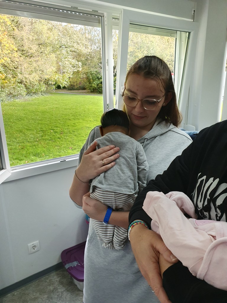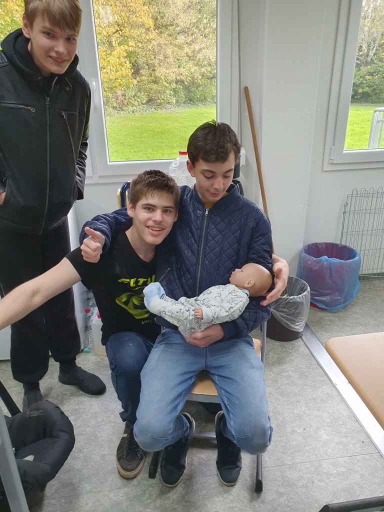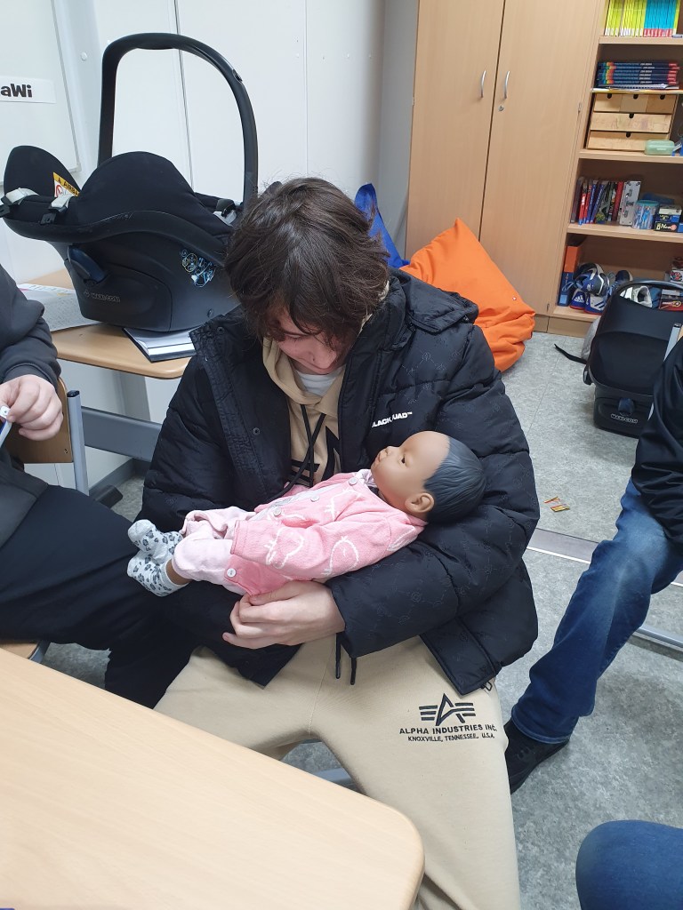 Acht Schüler:innen unserer Klasse stellten sich zu Beginn der Woche dieser Verantwortung und nahmen ein Baby teils alleine und teils in Partner:innenarbeit auf. Norbit, Jonas, Lia, Josephine und Elias wurden die Babys getauft. Die Schüler:innen lernten, wie sie die Babys stillen, das Fläschchen geben, wie sie es beruhigen, umziehen und das Windeln wechseln funktioniert.