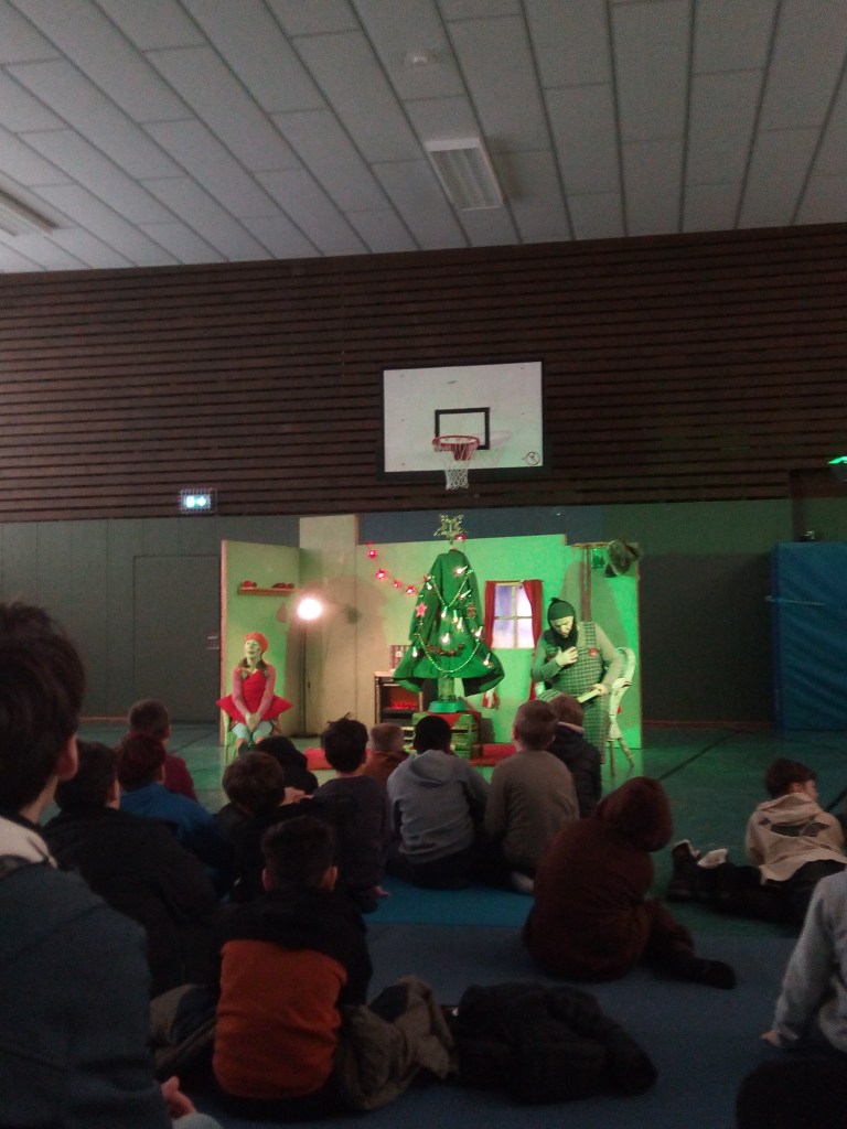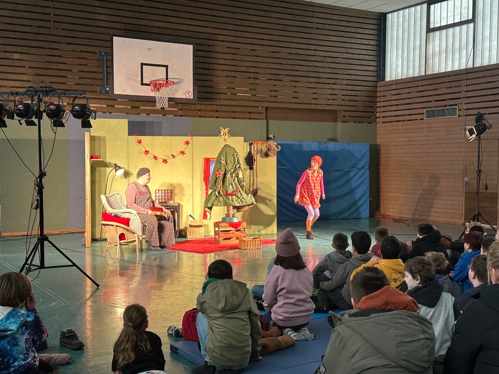 Zwei Aufführung wurden von jeweils 5 Klassen der Schule besucht. Aufmerksam verfolgten die Kinder das weihnachtliche Theaterstück indem ein Mantel, eine Axt aber kein Tannenbaum vorkamen. Am Ende nahm das Stück ein glückliches Ende und die Schauspieler erhielten einen großen Applaus. Als Zugabe durften die Kinder noch Fragen zum Stück, den Schauspielern und den Requisiten stellen.