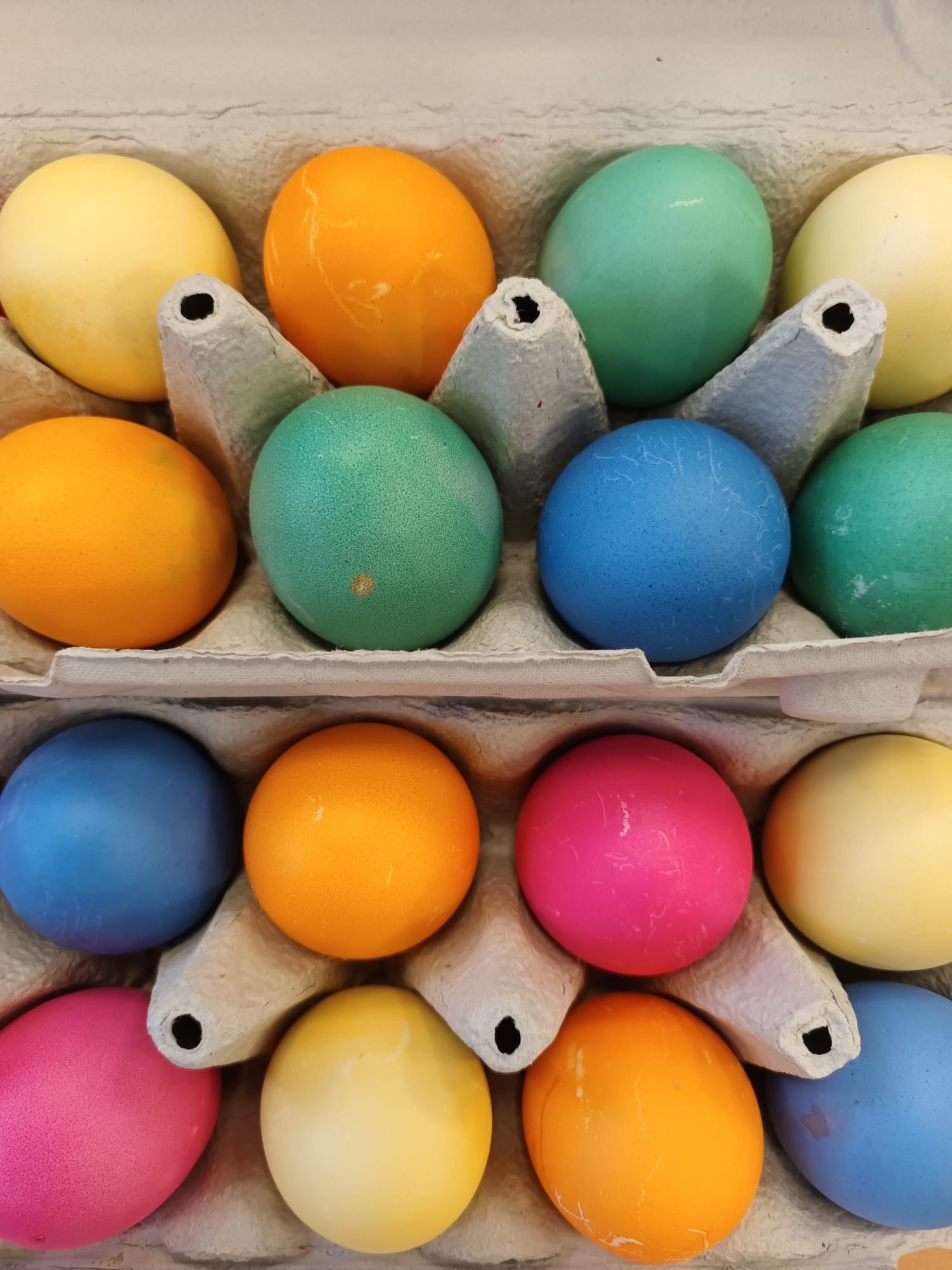 Jedes Kind hatte eine spezielle Aufgabe. Mal musste Waffelteig hergestellt werden, mal musste eine Bestellung ausgeliefert werden. Das Färben der Eier hat allen großen Spaß gemacht. Am Ende leuchteten die Eier in bunten Farben. Die Rückmeldung der Schülerinnen und Schüler war durchweg positiv. Als Lohn für ihre Arbeit durften die Schüler:innen, die fleißig geholfen haben, 10 gefärbte Eier mit nachbrausen nehmen. Alle sind sich einig, dass eine solche Verkaufsaktion sicher bald wiederholt werden soll. Im Unterricht haben die Schüler:innen am Folgetag im Mathematikunterricht ausgerechnet wie hoch der „Gewinn“ ausgefallen ist.