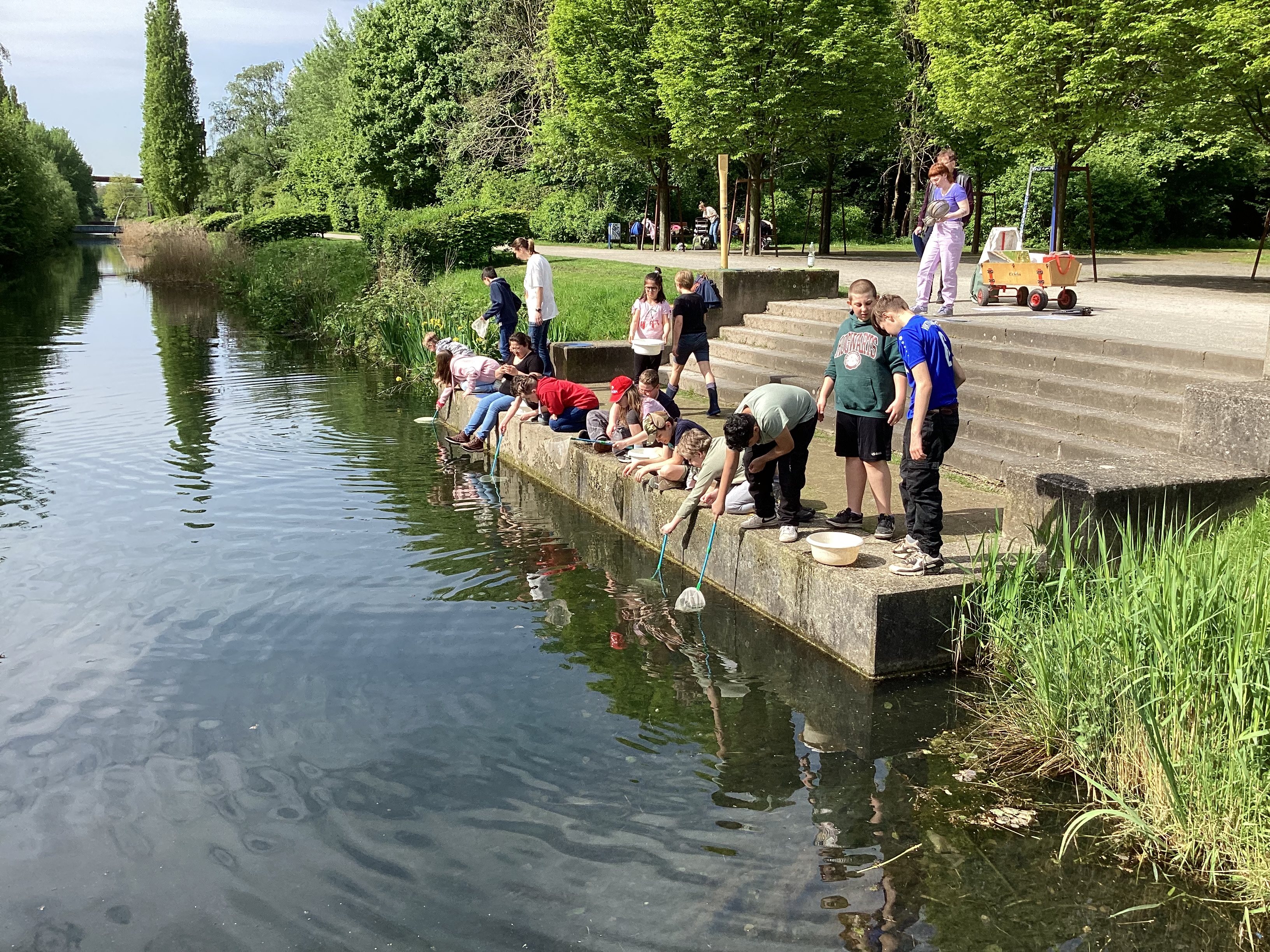Schon seit einigen Jahren besuchen die Kinder der Alfred Adler Schule einmal im Jahr die Emscher im Duisburger Landschaftspark. Ausgestattet mit Gummistiefeln und Käschern untersuchen die kleinen Forscher akribisch den renaturierten Fluss. Sie fangen Kleintiere aus dem Gewässer, bestimmen diese unter fachkundiger Anleitung und ziehen aufgrund der vorhandenen Arten Rückschlüsse auf die Wasserqualität.