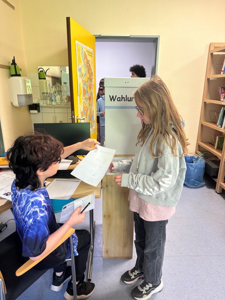 Mit einer „simulierten“ Wahl, lernen die Kinder bereits frühzeitig den Ablauf einer Wahl kennen. Dazu erhielt jedes Kind einen „Ausweis“, eine „Wahlbenachrichtigung“und jede Schüler:in durfte die eigene Stimme in einer eigens dafür eingerichteten Wahlkabine abgeben. Selbstverständlich wurden Parteien gewählt, die die Klassen zuvor selbst gegründet hatten.
