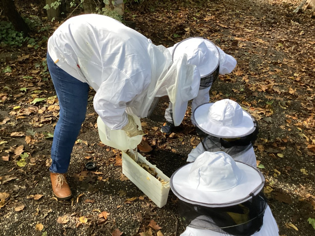 Heute hat sich die Bienenklasse im Bienengarten versammelt, um den Bienen neues Futter zu bringen. Am Morgen war noch wenig Flugbetrieb im Bienengarten. Täglich nehmen die Tagestemperaturen ab, so dass wenig Flugbetrieb zu beobachten ist. Damit die Bienen im Winter genügend Futtervorräte haben, werden sie nun von den Schulimkerinnen mit Weizenstärkesirup versorgt. Dabei halfen die Kinder der Bienenklasse fleißig mit und lernten viel Neues über ihre Schulhaustiere.