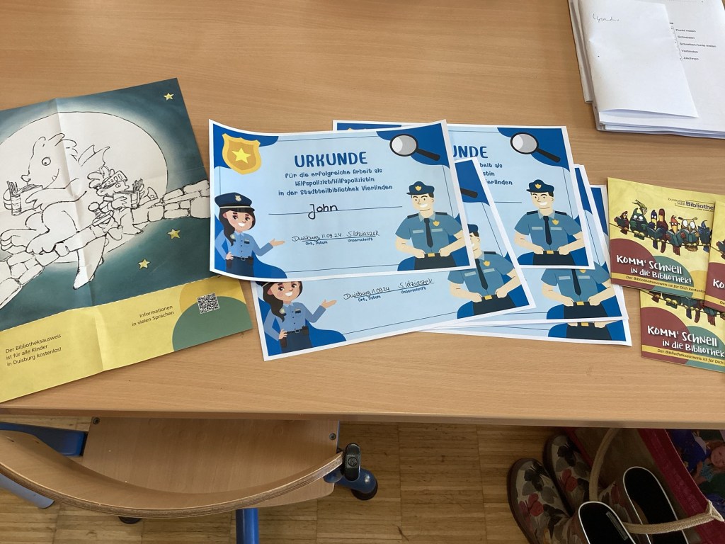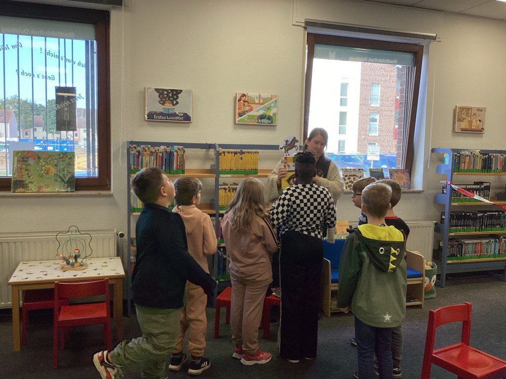 Die Leiterin der Stadtteilbibliothek hatte ein spannendes Spiel für die Kinder der Bienenklasse vorbereitet. Heute erhielten die Schüler:innen nämlich ihre Einführungsstunde in die Stadtteilbibliothek. Wie Detektive und mit einer Lupe bewaffnet durchstöberten die Kinder die Regale der Kinderabteilung und lösten so die vorbereiteten Rätselaufgaben. Am Ende wussten die Kinder nun welche Medien sie ausleihen dürfen und wie eine Ausleihe funktioniert. Am Ende wurden verschiedene Medien zum Thema Märchen ausgeliehen und jedes Kind bekam eine Urkunde ausgehändigt.