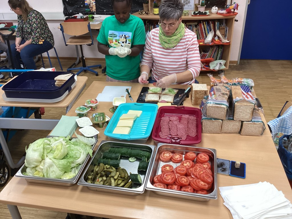 Die Bienenklasse hatte sich mit Frau Weyers um die Ausrichtung eines gesunden Schulfrühstücks beworben. Tatsächlich durften die Kinder der Klasse dann im September fleißig Brote schmieren und die Schülerinnen und Schüler mit einem gesunden Pausenbrot versorgen!