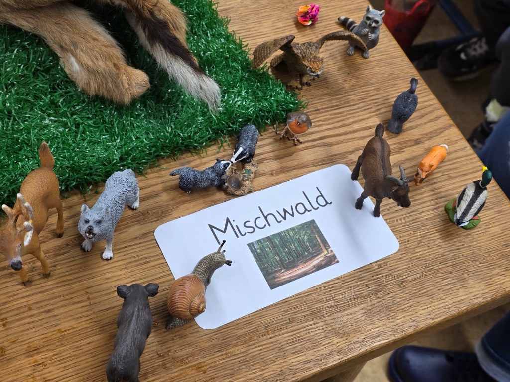 Es war ein Erlebnis für die Schüler:innen die Hühner, Enten, Gänse und Puten zu beobachten, ihr Gegacker, Gekrähe und Geschnatter zu hören. Für die Kinder war es besonders spannend, wenn das Dammwild sich ihnen auf wenige Meter näherte, so dass man meint, sie anfassen zu können. Besonderen Spass macht es, die muntere Ziegenschar zu streicheln und zu füttern. Den Vormittag hatte die Waldpädagogin Frau Neff geplant und ein schülerorientiertes Programm durchgeführt.