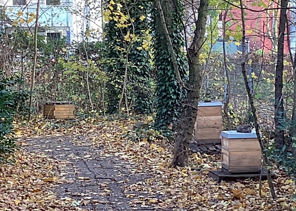 Frau Weyers: „In den Herbstferien sind Frau Yahya und ich hier zu den Bienen gekommen und haben festgestellt, dass ein Bienenvolk komplett weg war. Also alle Bienen waren weg und wir haben sie nicht gefunden. Da haben wir geforscht und später gemerkt, dass Hornissen fliegen und zwar keine Hornissen, die hier in Deutschland zu Hause sind, sondern asiatische Hornissen, die sich hier immer mehr verbreiten.“