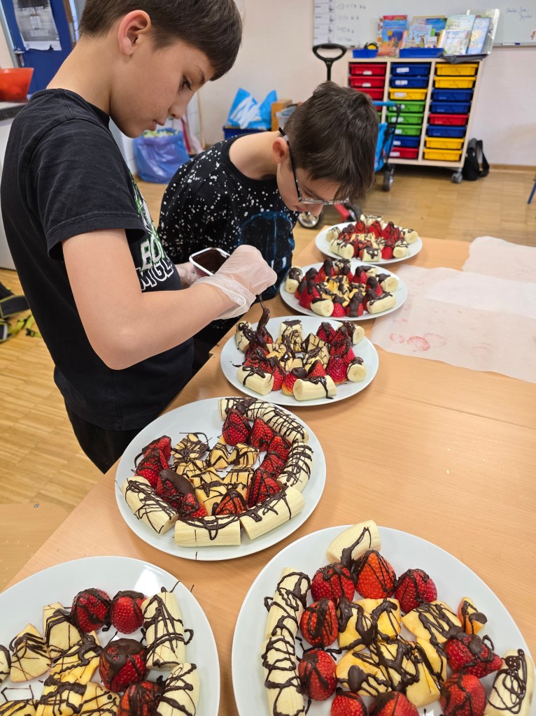 Während einige den Einkauf erledigten, wuschen und putzten andere Kinder fleißig das Obst oder arrangierten appetitliche Teller. Zum Schluss brachte ein „kleiner Lieferdienst“ Teller mit Schokoladenobst in jede Grundschulklasse. So konnten in den Pause alle gemeinsam die Leckereien verspeisen.