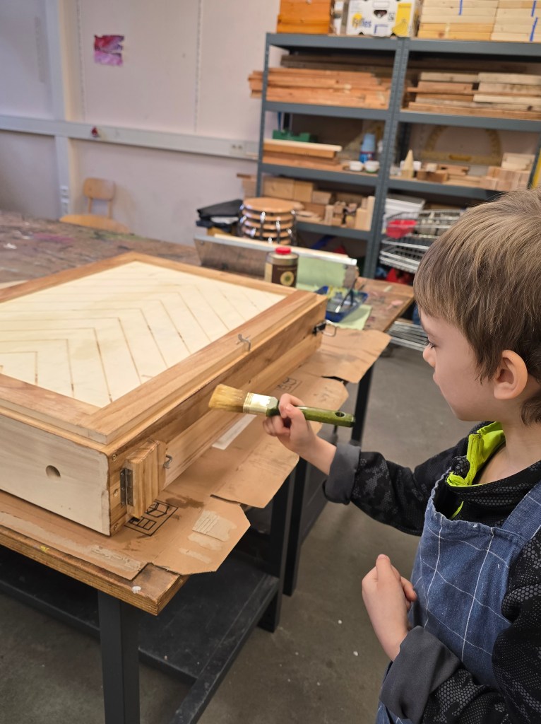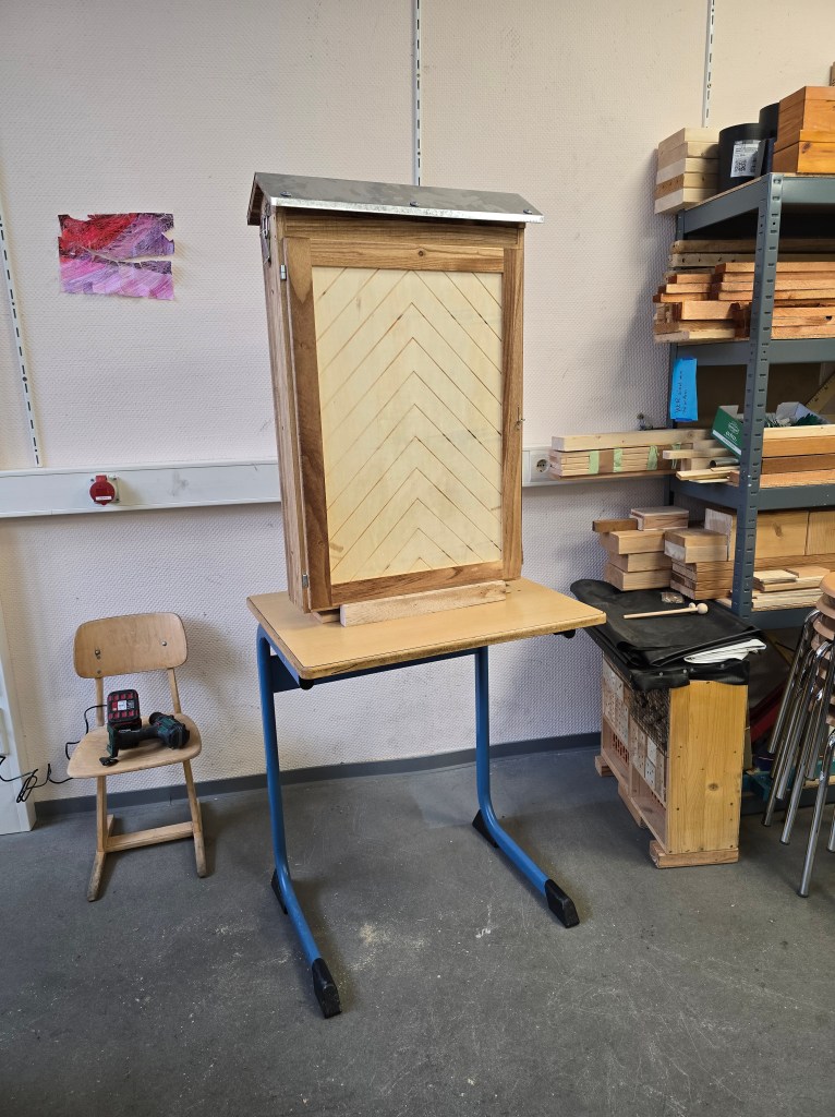 Die lang ersehnte Lieferung der Schaubeute für den Bienenlehrpfad der Alfred Adler Schule ist endlich eingetroffen. Da das Holz noch unbehandelt war, mussten die Schüler:innen eine Schicht Leinöl aufbringen. Anschließend wurde die Beute sicher auf ein Ständerwerk befestigt, damit sie für die Besucher des Bienengartens gut einsehbar ist.