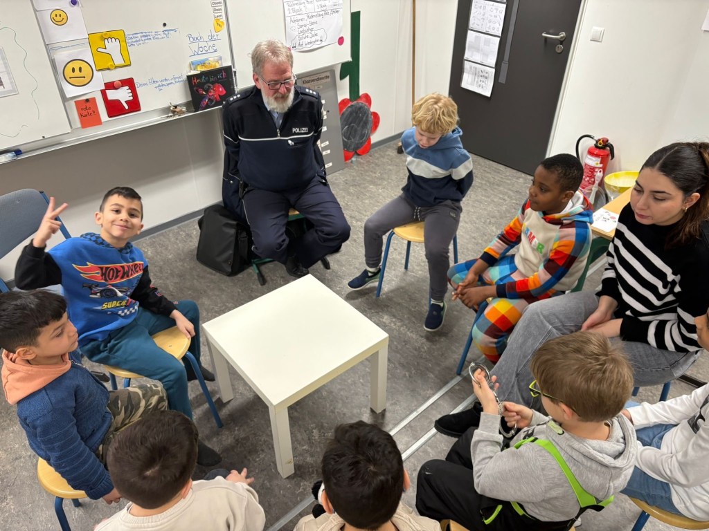 Gemeinsam mit den Kindern hat Herr Radtke überlegt, was Fußgänger alles im Straßenverkehr wissen müssen. Besonders der richtige Umgang mit Zebrastreifen, Ampeln und das Erkennen von Verkehrsschildern wurden besprochen. Die Schüler:innen hatte natürlich auch Zeit Fragen zustellen, die Herr Radtke geduldig beantwortete. Anschließend übten die Kinder, auf dem Gehweg zu gehen, sicher über die Straße zu schauen und sie zu überqueren. Die Schüler:innen zeigten großes Interesse und waren sehr aufmerksam.