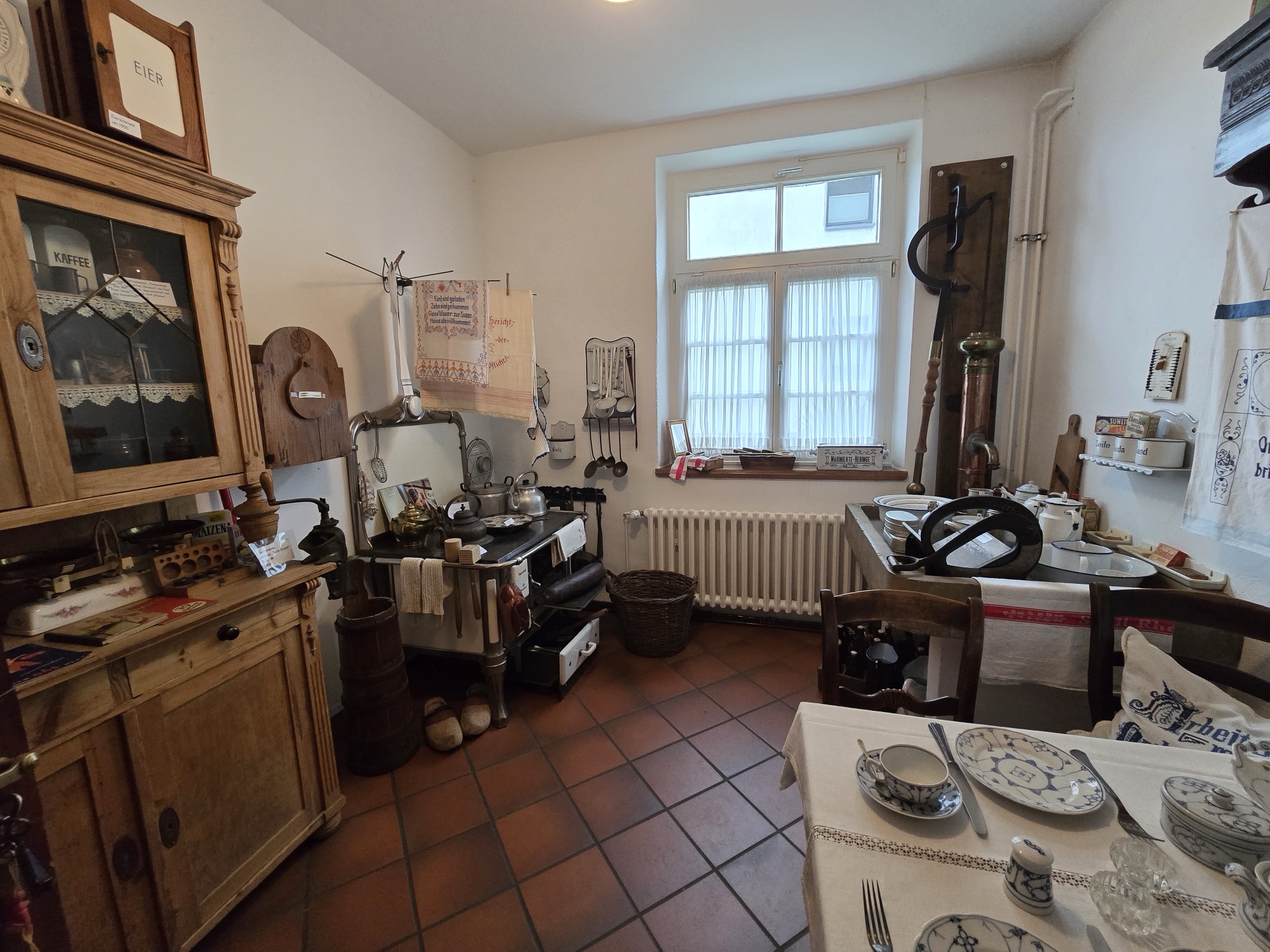 Die Innenräume wurden vom „Freundeskreis lebendige Grafschaft e.V.“ in den vergangenen Jahren restauriert und als kleines Heimat- und Schulmuseum ausgebaut. Liebevoll mit Exponaten früherer Zeiten ausgestattet bieten „Deel“ (Diele), Schloopkaamer“ (Schlafzimmer) und „Köök“ (Küche) einen interessanten Einblick in die Lebenswelt der Zeit um die Jahrhundertwende und lassen ahnen, wie der Dorflehrer mit seiner Familie gewohnt hat. Eines der Klassenzimmer wurde mit Schulmöbeln der 20er und 30er Jahre ausgestattet. Herr Pfeiffer versammelte die Kinder der Alfred Adler Schule im Klassenraum und erklärte wie früher mit Schiefertafeln und Griffeln, aber auch mit dem Rohrstock unterrichtet wurde.
