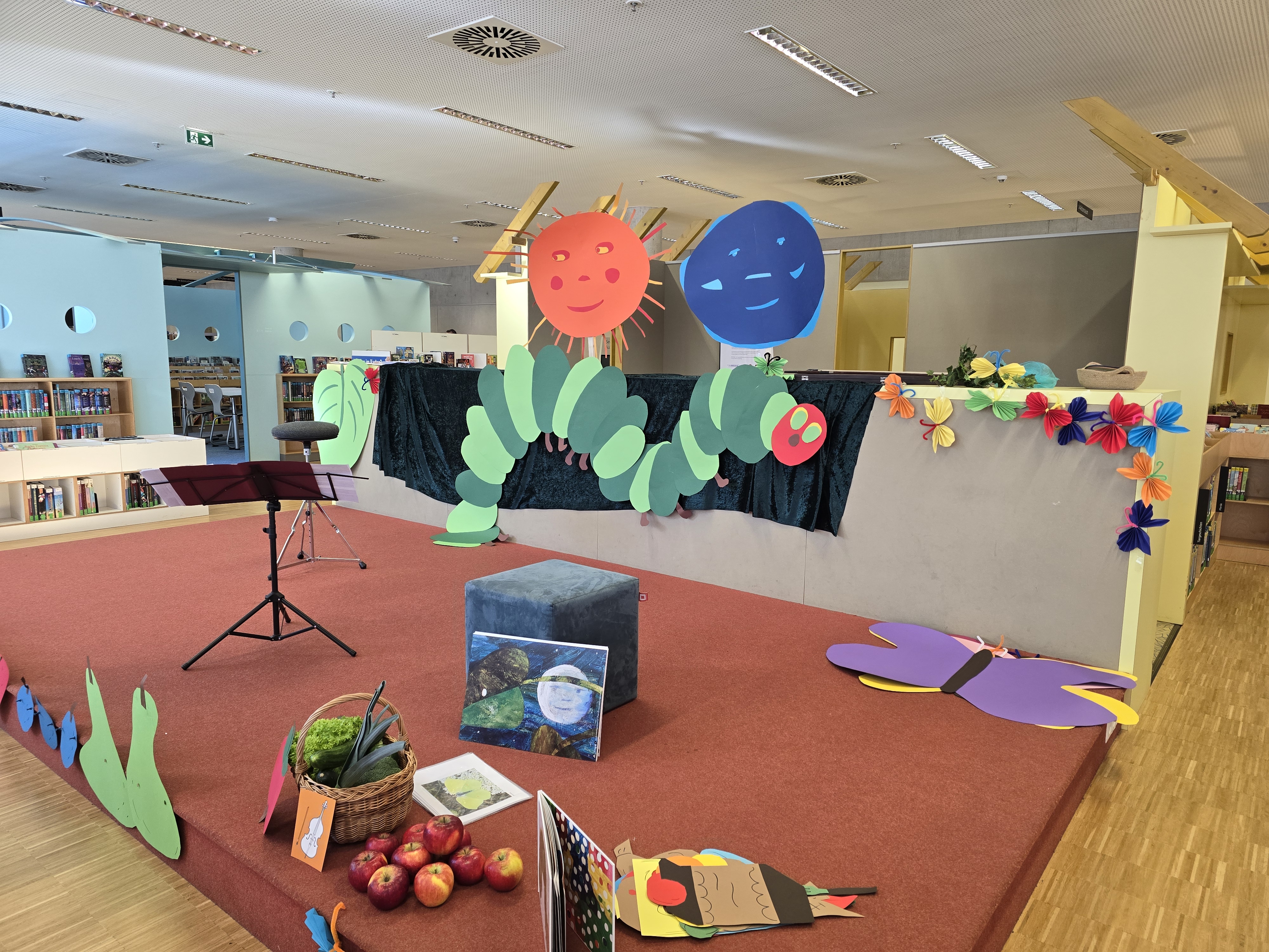 Die Duisburger Philharmoniker haben in die Stadtbibliothek zu einer ganz besonderen Lesung eingeladen. Hier konnten sowohl Kindergartenkinder als auch Grundschüler:innen gemeinsam einer Geschichte lauschen. Vorgelesen wurde das Buch „Die kleine Raupe Nimmersatt“ von Eric Carle.