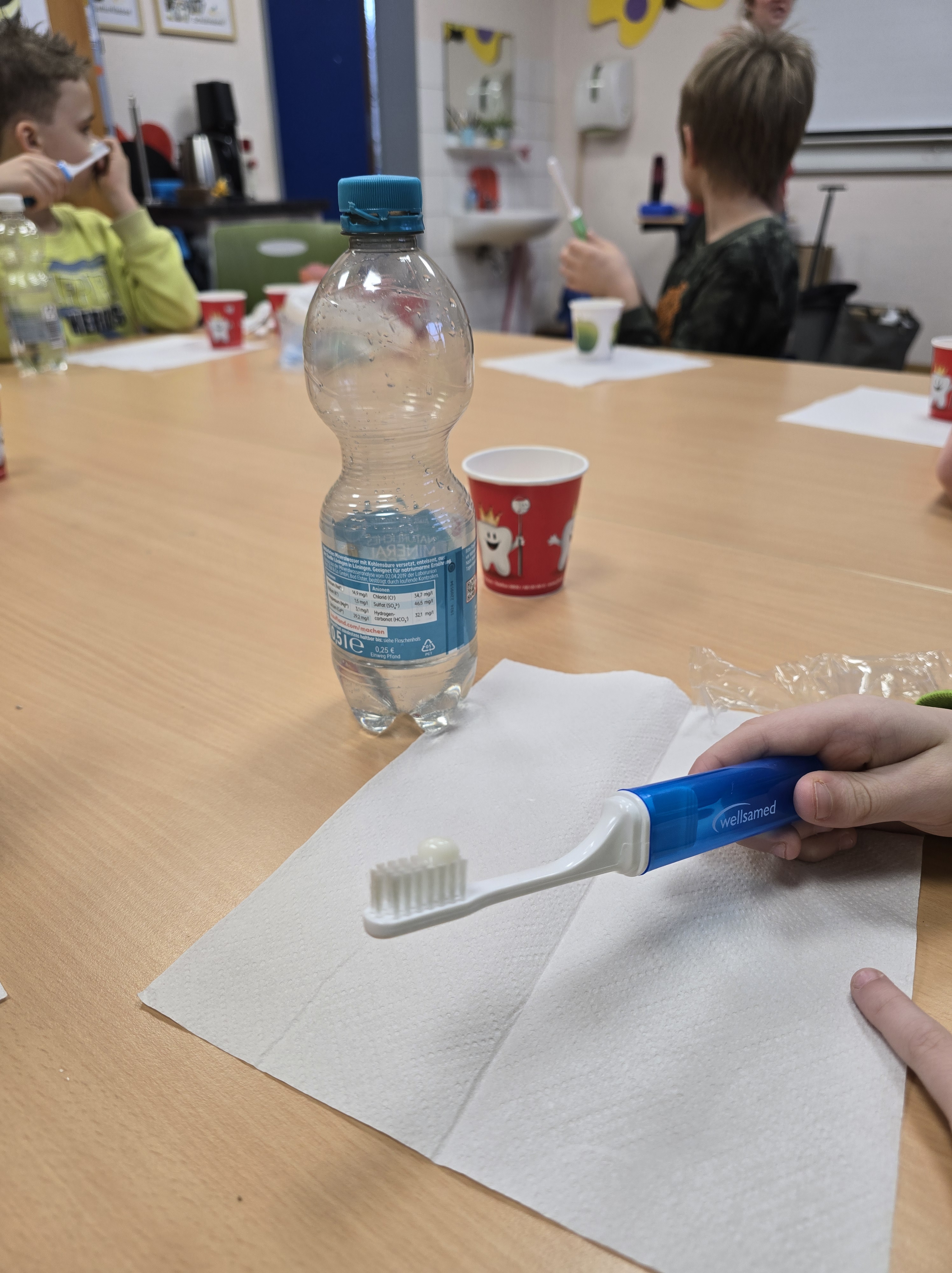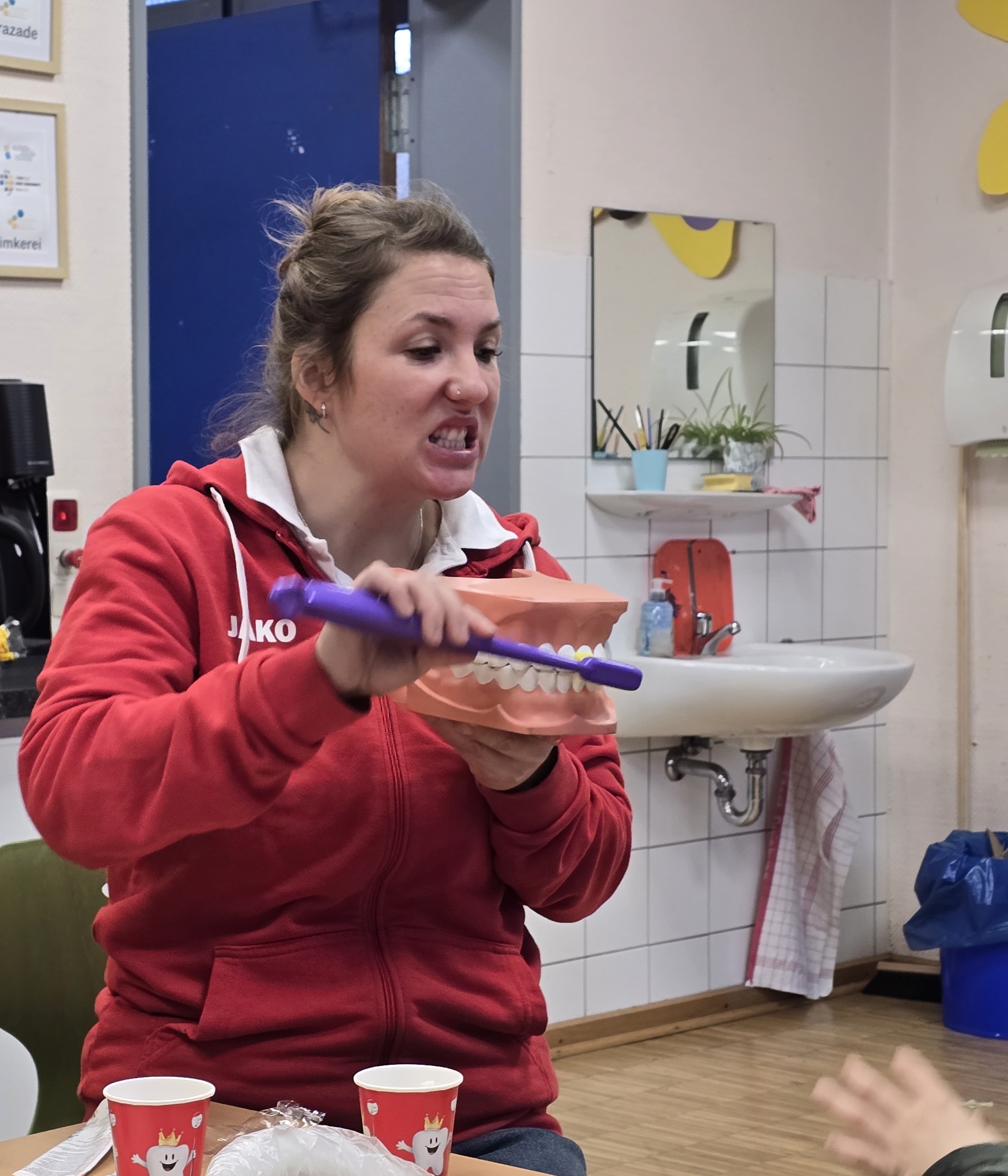 Zuvor werden alle Schülerinnen und Schüler über die richtige Zahnpflege aufgeklärt. Die Zahnfee erklärt genau, wie richtiges Zähneputzen geht. Mit dabei ist immer das Gebiss KAI.