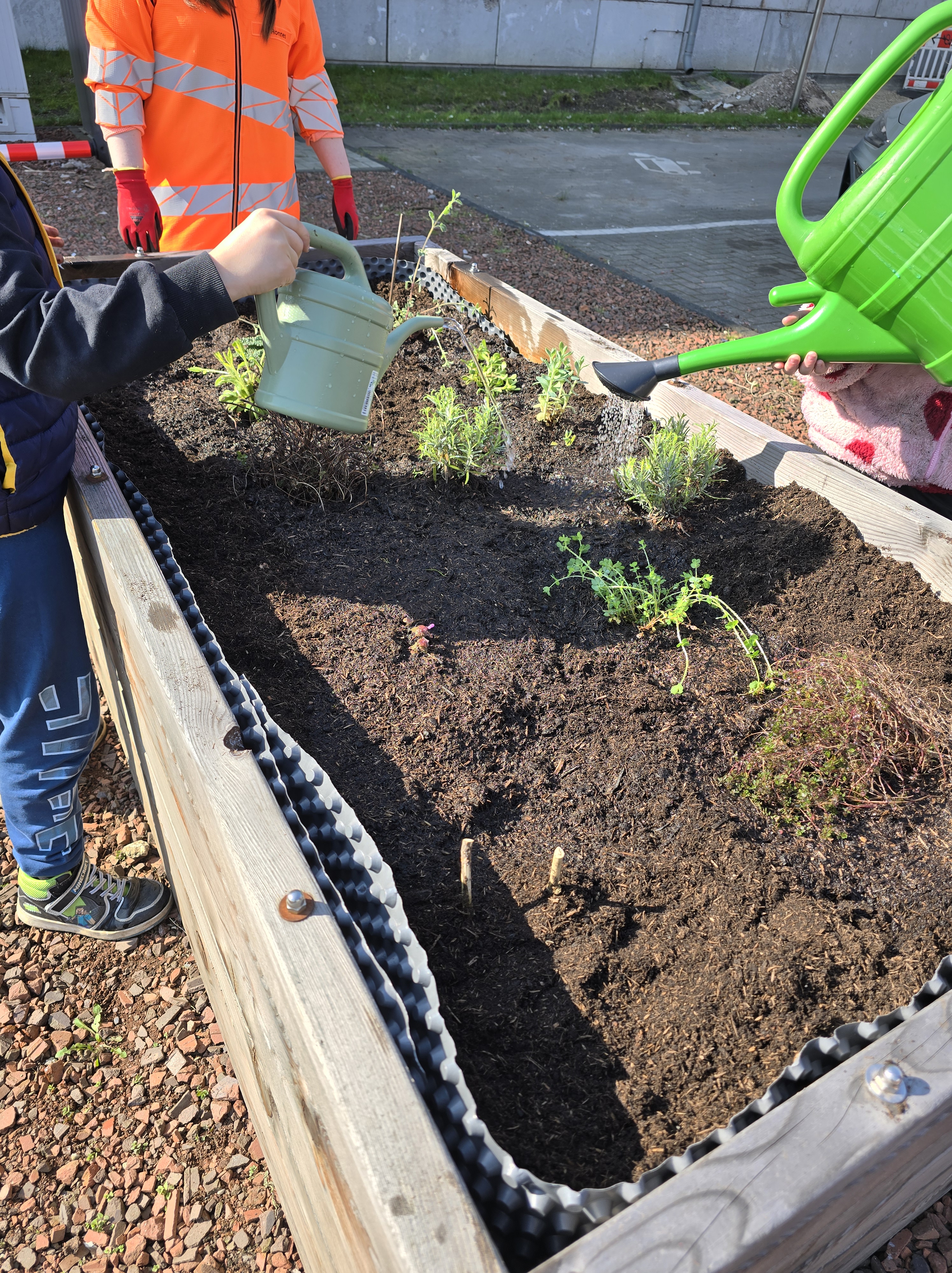 Unter fachkundiger Anleitung der Umwelt- und Gartenexpertinnen der Wirtschaftsbetriebe Nord wurden Setzlinge gesetzt: Löcher wurden gegraben, Erde vorbereitet und darauf geachtet, dass Pflanzabstände sinnvoll gewählt sind. Das Gießen und die regelmäßige Pflege der Pflanzen standen von Anfang an im Mittelpunkt. Schon beim ersten Pflegen zeigten sich erste Erfolge: frische Triebe und erste Blütenknospen motivierten die Gruppe und bestätigten den Lernfortschritt.