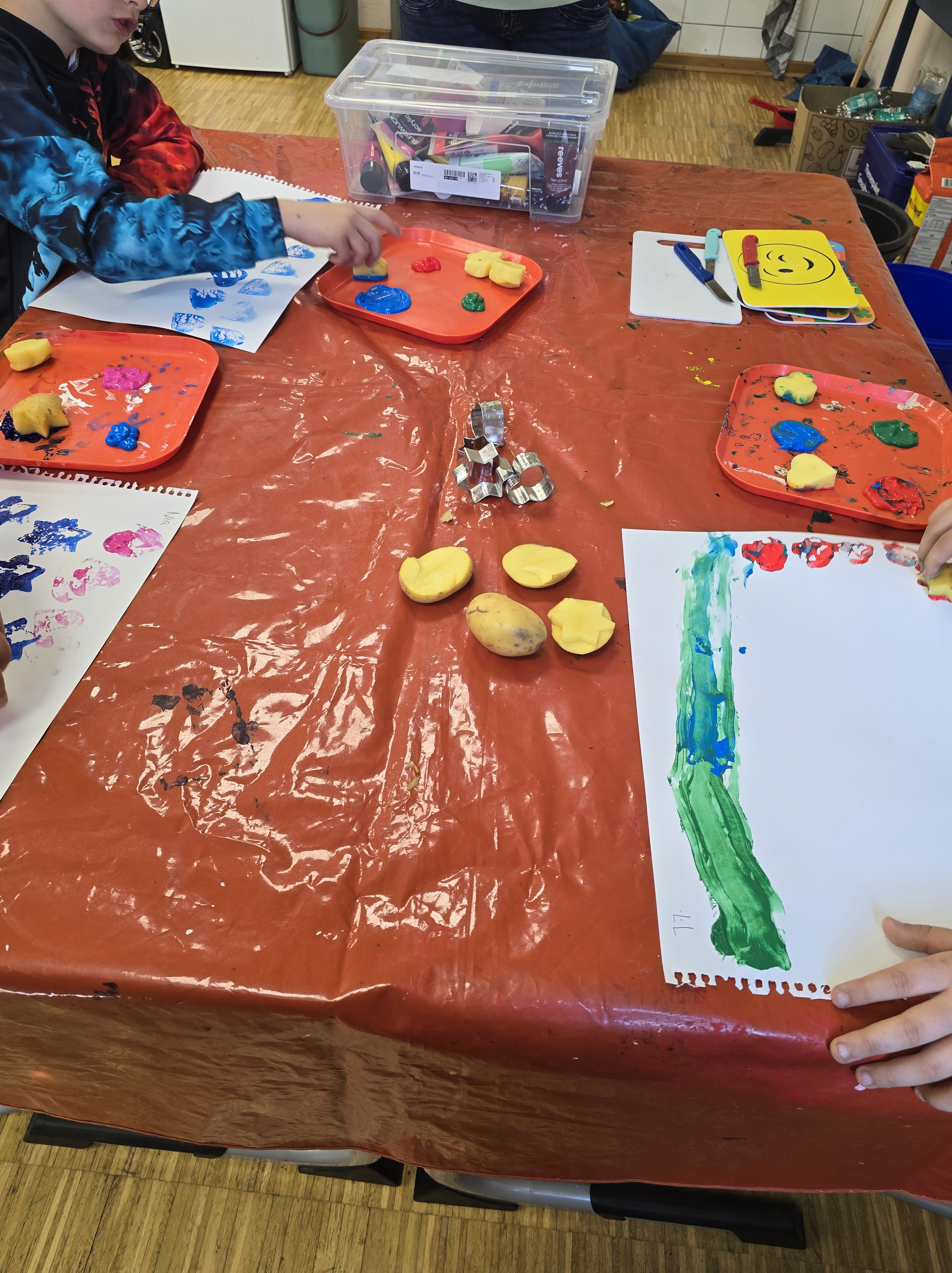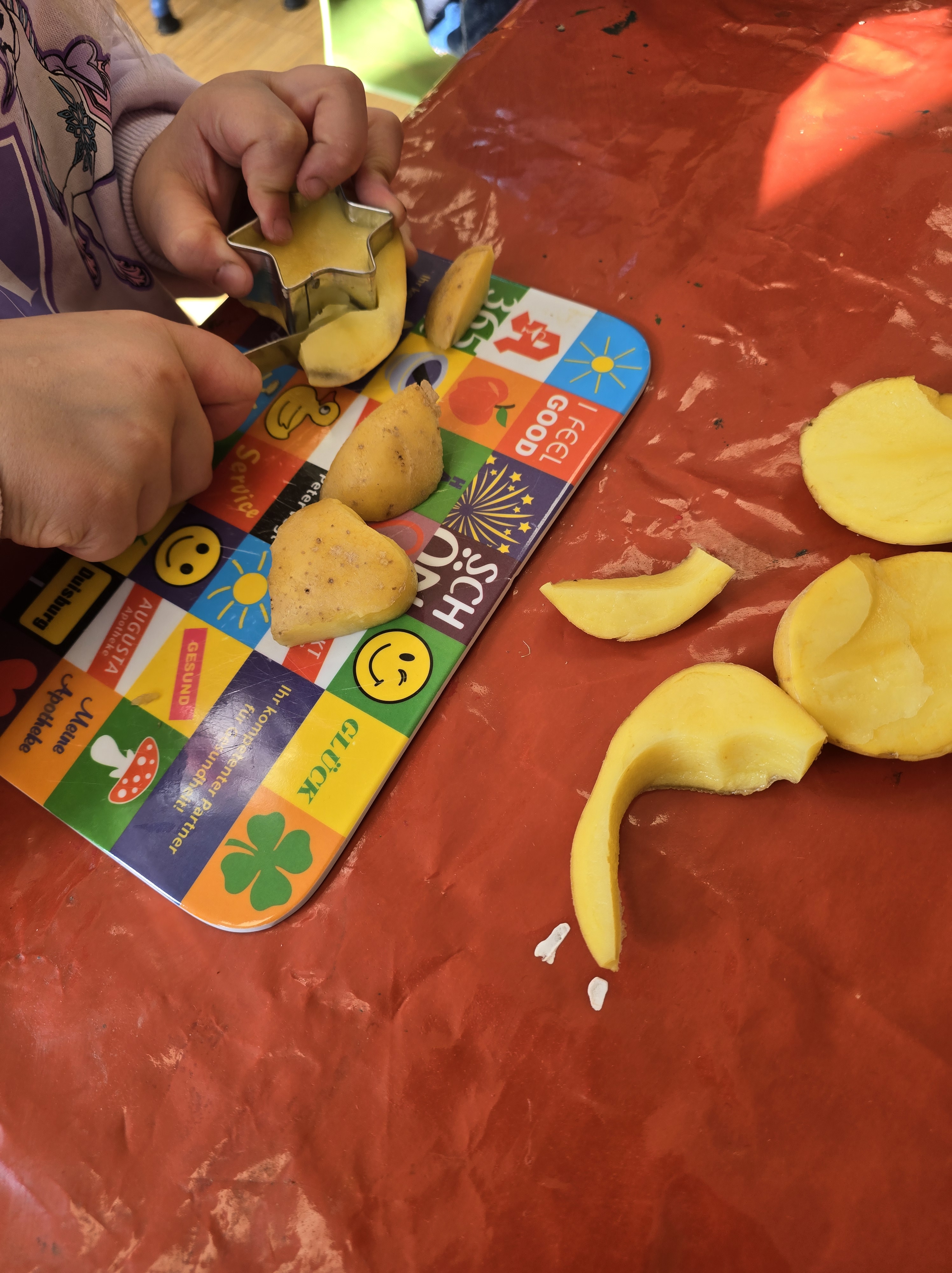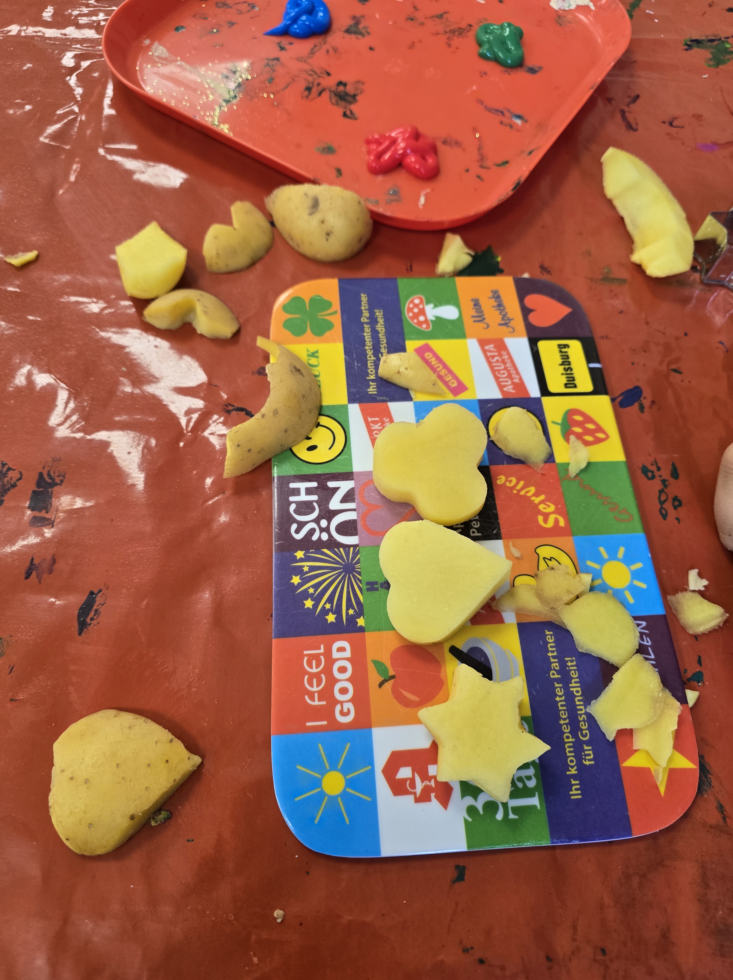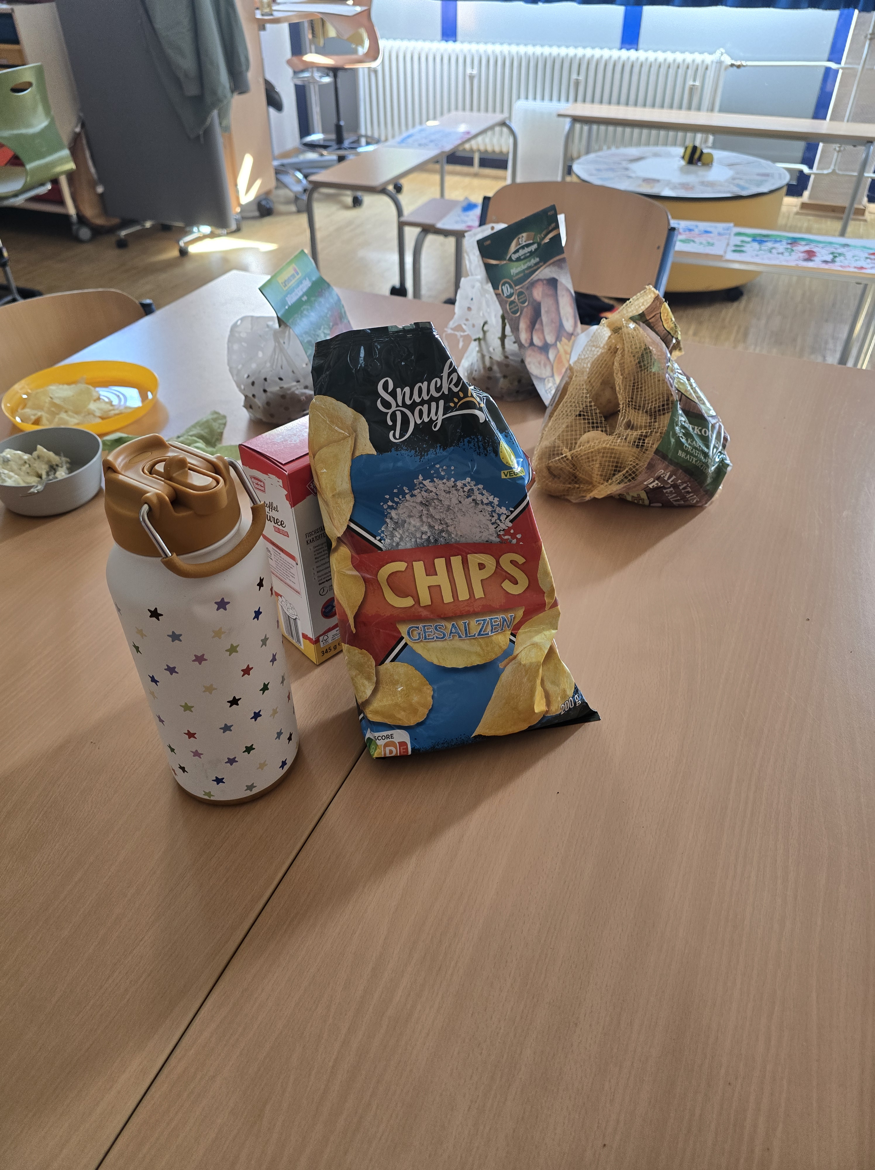 Warenkunde & Verkostung: Zusätzlich wurden Kartoffelprodukte besprochen, vorgestellt und auch zum Probieren angeboten, um den Bezug zu Ernährung herzustellen. Im Kunstunterricht entstanden mit Kartoffeln Drucke – bunt und vielfältig – als kreative Auseinandersetzung mit dem Thema Lebensmittel und Pflanzen.