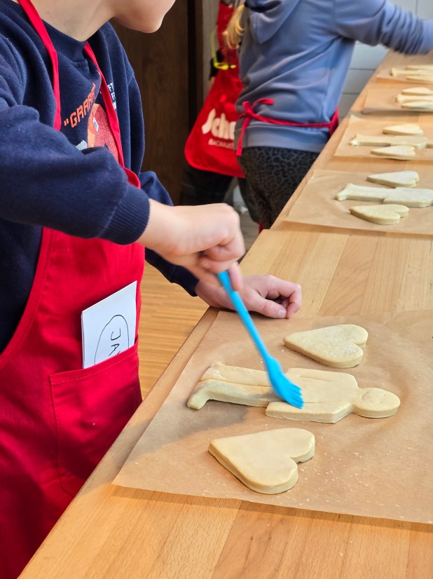 Der Besuch der Bienenklasse in der Kinderbackstube des Backunternehmens Schollin war ein sehr erlebnisreiches Lernangebot, das die Schülerinnen und Schüler fußläufig von der Schule aus erreichen konnten. Vor dem Backen erklärte eine freundliche Mitarbeiterin den Kindern im sogenannten Kornwerdegang geduldig die Arbeitsprozesse, die bis zum Erhalt des Mehls notwendig sind. Dabei bekamen die Kinder Einblicke in den Weg der Rohstoffe, Vermahlung, Reinigung und Verpackung – Schritte, die oft hinter dem kulinarischen Endprodukt verborgen bleiben. An vielen Mitmachstationen hatten die Kinder die Möglichkeit, eigenständig Fragen zu stellen und die Abläufe praktisch nachzuvollziehen. Diese aktive Beteiligung regte tiefergehende Nachfragen an und förderte das naturwissenschaftliche Verständnis sowie das Alltagswissen rund ums Brot und Mehl.