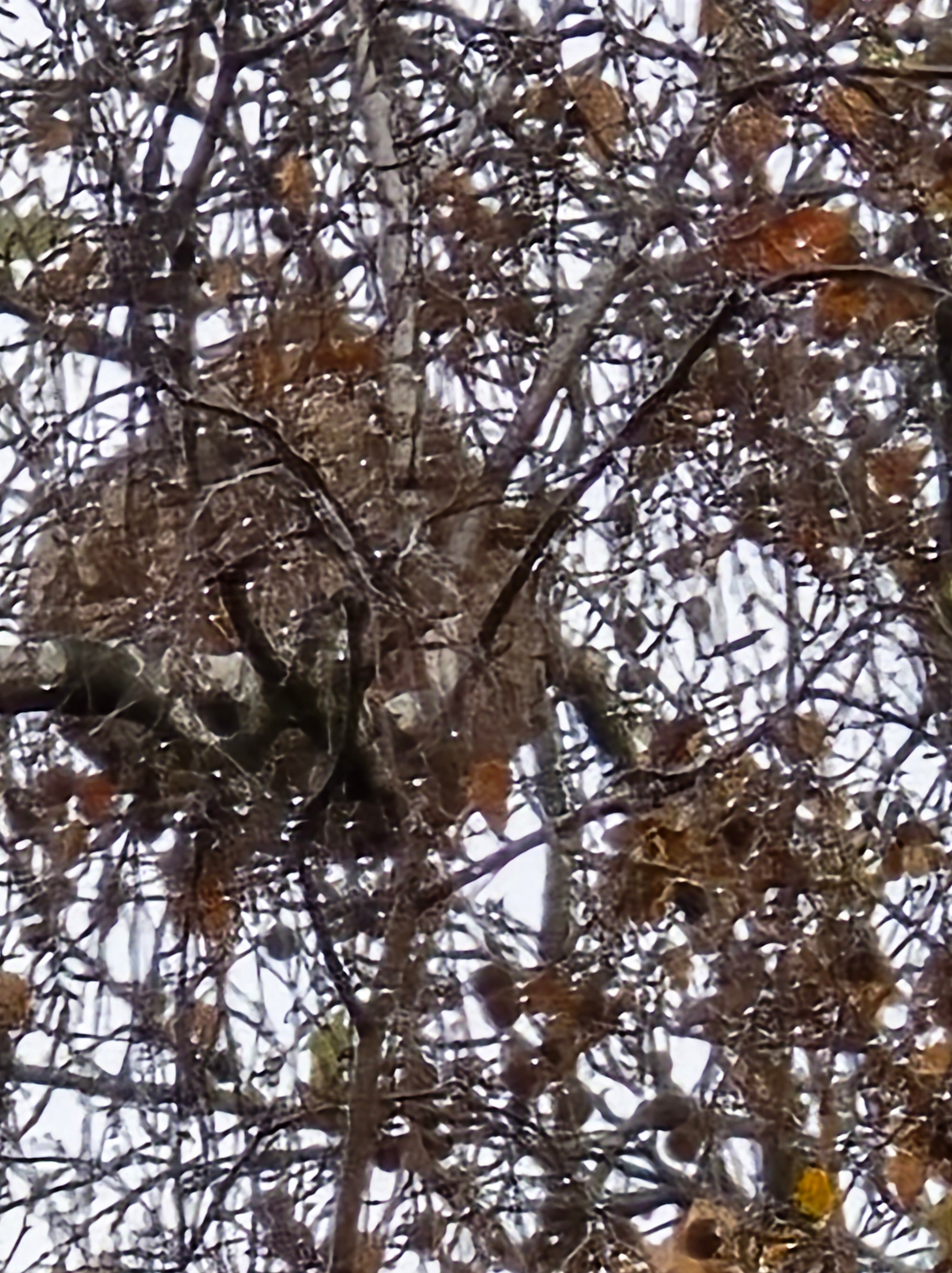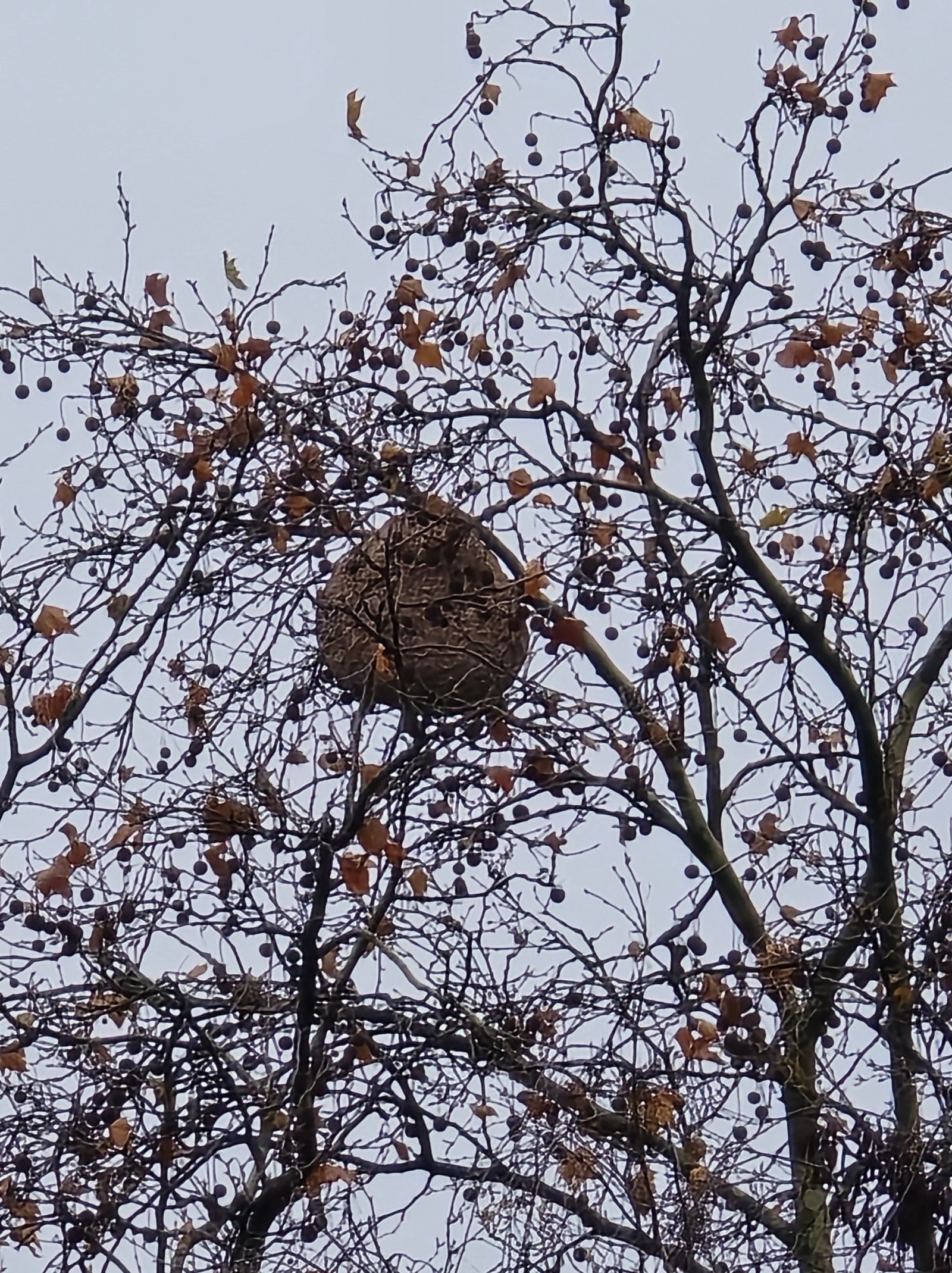 Entdeckung: Direkt neben unserer Schulimkerei in Duisburg wurde ein Nest der asiatischen Hornisse (Vespa velutina) in einer Baumkrone gefunden. Das Nest liegt nah an unseren Honigbienenvölkern.